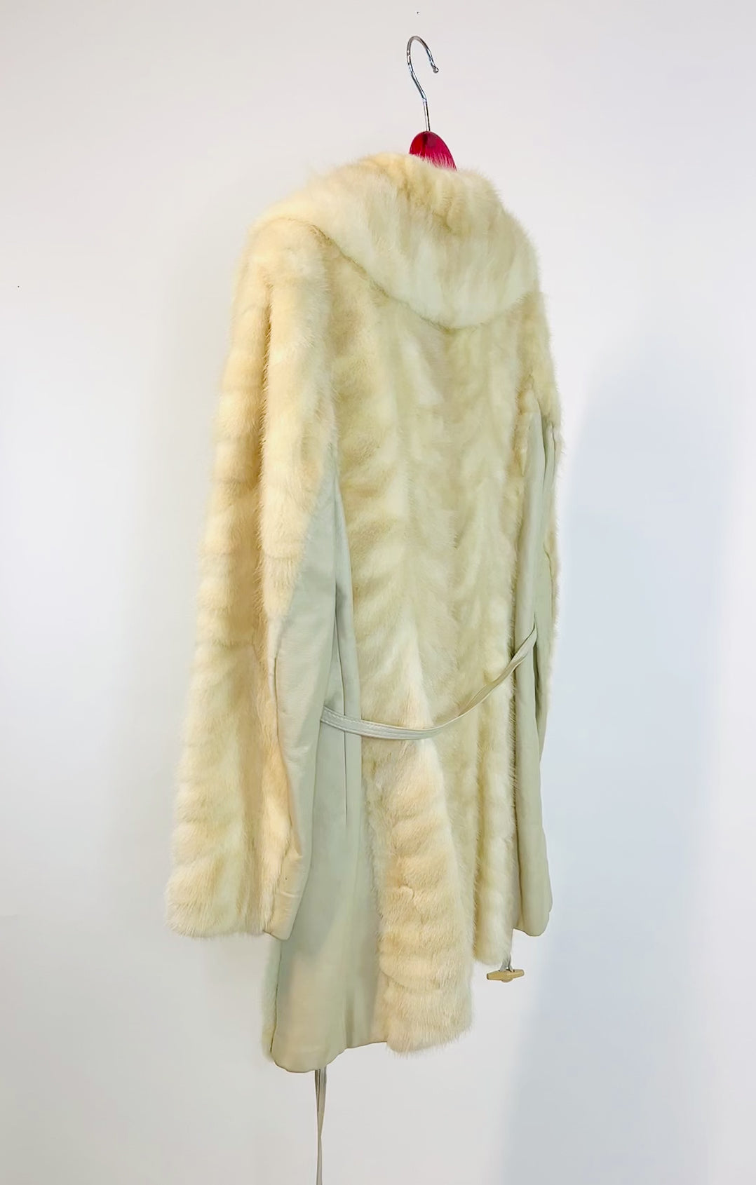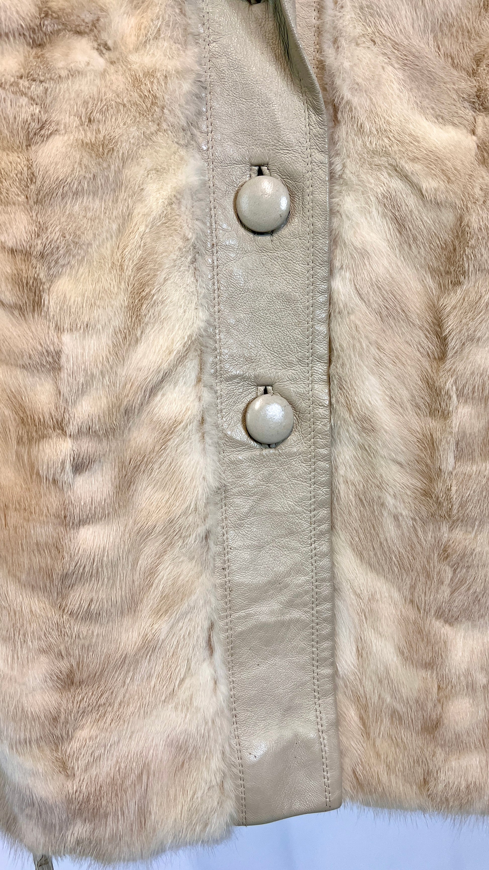 1970s Blonde Mink Fur Coat. Leather buttons and leather waist straps with toggles, one replaceable one that ties. Great Condition!